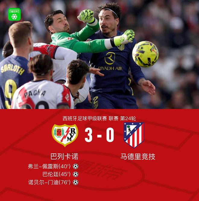 北京時間2月15日西班牙足球甲級聯賽 聯賽 第24輪,巴列卡諾主場對陣馬德里競技。巴列卡諾弗蘭-佩雷斯破門,巴倫廷破門,諾貝爾-門迪破門。最終比分巴列卡諾 3-0 馬競。